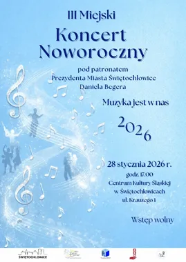 W ramach III Miejskiego Koncertu Noworocznego - “Muzyka jest w nas” program zaprezentują wykonawcy reprezentujący różne środowiska muzyczne. Koncert odbędzie się w Centrum Kultury Śląskiej w Świętochłowicach. Dokładne informacje o terminie i godzinie: